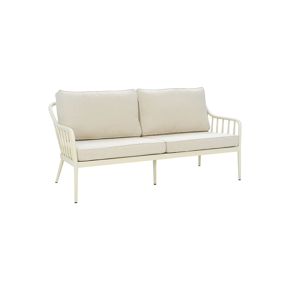 Vaalea Coleville-ulkosohva luo raikkaan ilmeen terassille. Vaalea väri on turvallinen käytössä, sillä pehmusteet on käsitelty vettä ja likaa hylkiviksi.