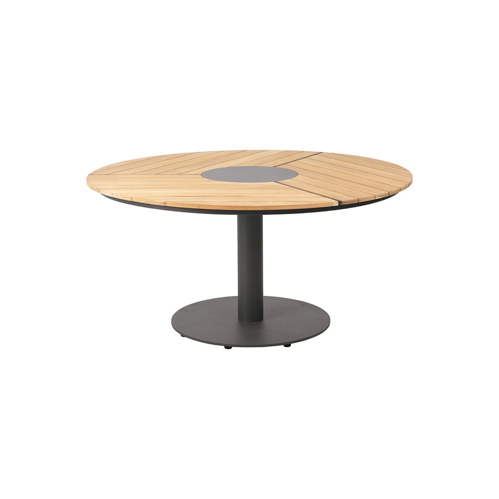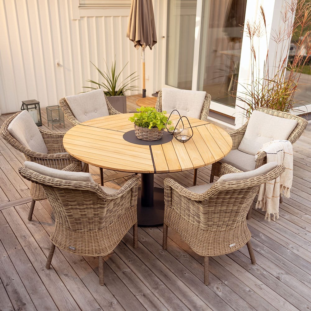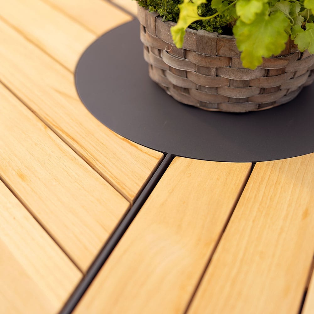 Brafab Peace-ruokapöytä on tiikkikantinen, pyöreä ulkopöytä, jossa on kestävä alumiinijalka. Pöydän keskellä on käytännöllinen metallitaso, joka kestää myös kuumia astioita.