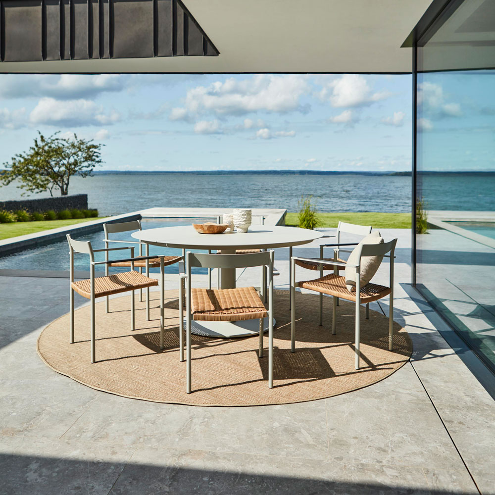 Pyöreä Peace-pöytä on nykyaikainen valinta kuuden hengen ruokailuun terassilla ja patiolla. Alumiinipöytä on käsitelty säänkestäväksi ja sitä voi huoletta käyttää ympäri vuoden. Kuuden hengen pöytään sopii useampikin istuja, kun seura on tarpeeksi hyvää! Minimalistinen keskijalka tuo pöydän käyttöön lisää mukavuutta.