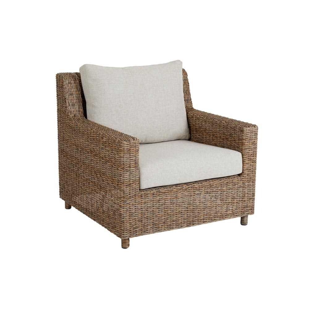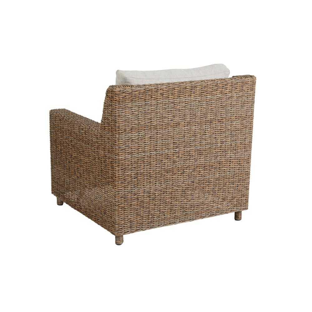Sandkorn-nojatuoli on klassinen ja tyylikäs kesäpuutarhan istuin. Nojatuolin runko on punottu vaaleanruskeasta polyrottingista ja tuolin pehmusteet on verhoiltu vaalealla, vettä ja likaa hylkivällä polyesterikankaalla.