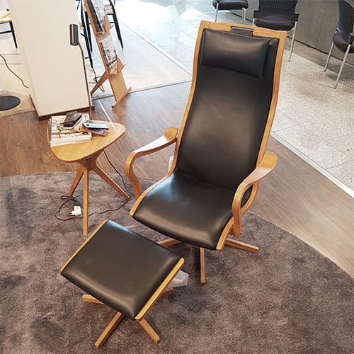 OUTLET | Furiren-lepotuoli on kauniisti taivutettua puuta ja siinä on musta nahkaistuin. Nyt tämä mallikappale raheineen edullisesti!