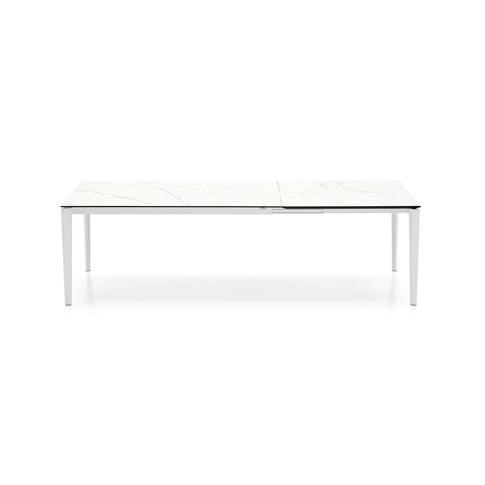 - Valkoiset metallijalat ja valkoinen marmorijäljitelmä-keraaminen kansi (110 cm valkoinen melamiinijatko, 130/160 cm yhdenmukainen keraaminen jatko)