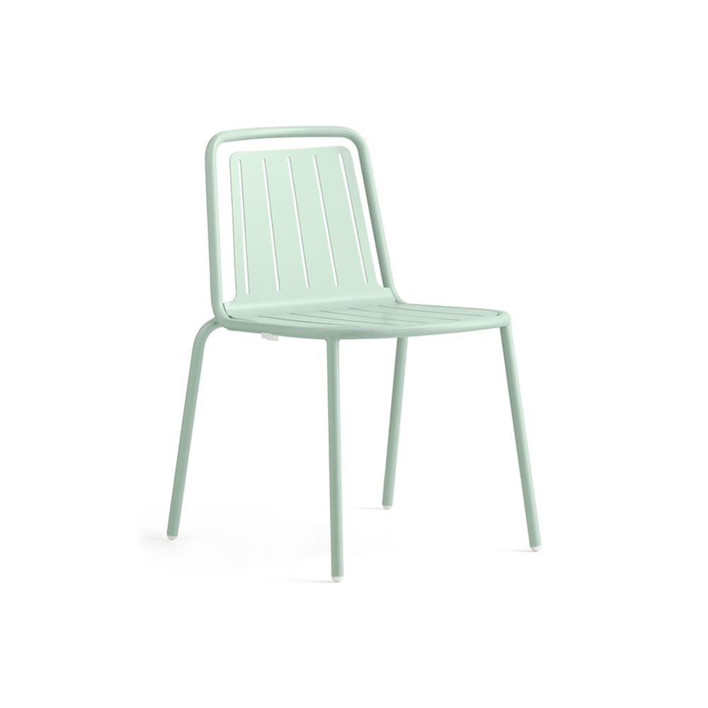 Tuoli on vaaleanvihreää, säänkestävää metallia.