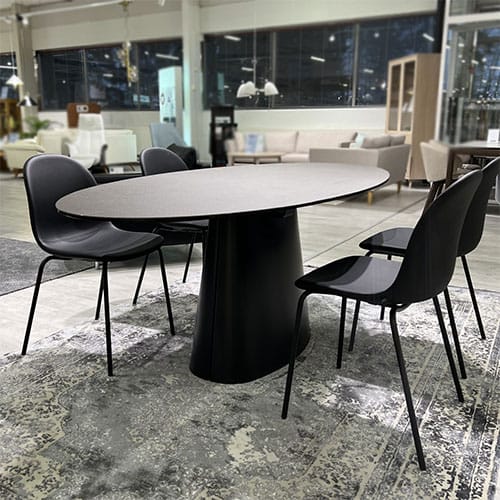 Tyylikäs Ellisse-ruokaryhmä sopii moderniin ruokailutilaan. Ryhmässä on ovaalin muotoinen ruokapöytä ja neljä mustaa Academy-tuolia.