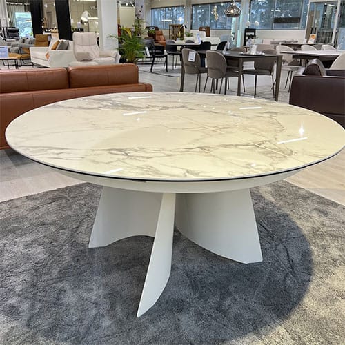 Upea Orion-ruokapöytä sisältää jatkolevyn. Pöydän kansi on marmorimaista vaaleaa keramiikkaa ja jalka on metallia. Jatkolevyn pinta on valkoista melamiinia.