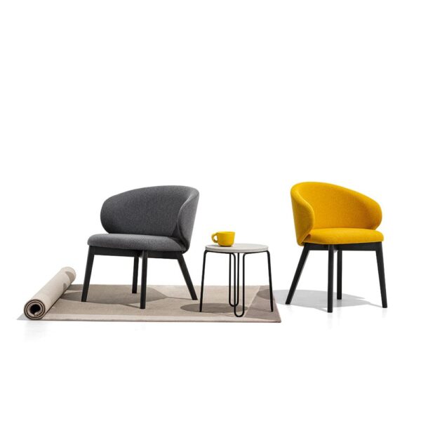 Connubian Tuka-nojatuoli sulkee istujan syleilyynsä. Pyöreä selkänoja kiertyy tyylikkäästi sivuille muodostaen mukavan ja esteettisesti erittäin miellyttävän kokonaisuuden.