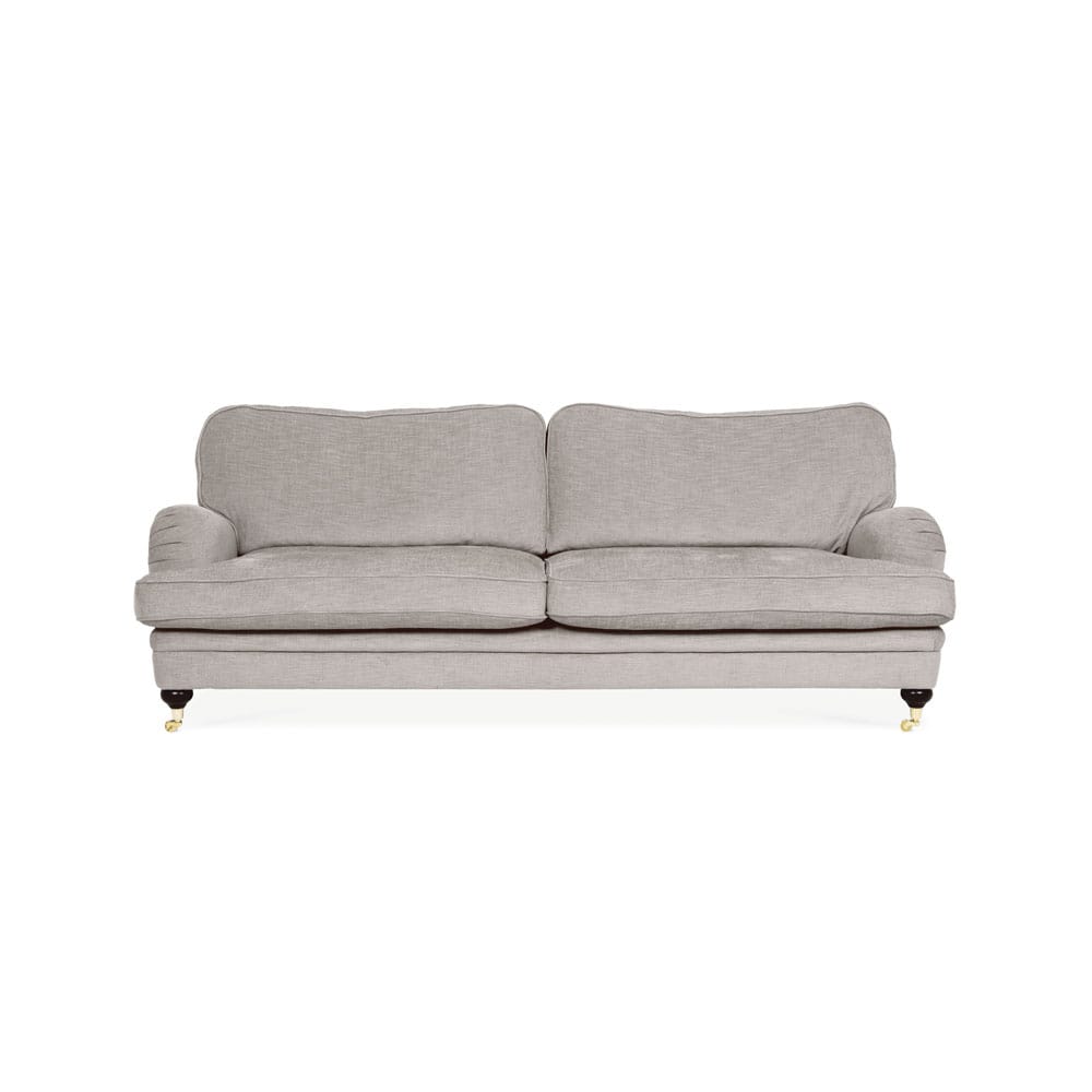 Klassinen Birmingham-sohva luo tyylikkään ja ajattoman tunnelman olohuoneeseen. Sohvassa on vaaleanharmaa Evita-kangasverhoilu ja tummat puujalat. Etujaloissa on messinkipyörät. Myös lattiaa suojaava pyörän kuppi sisältyy.