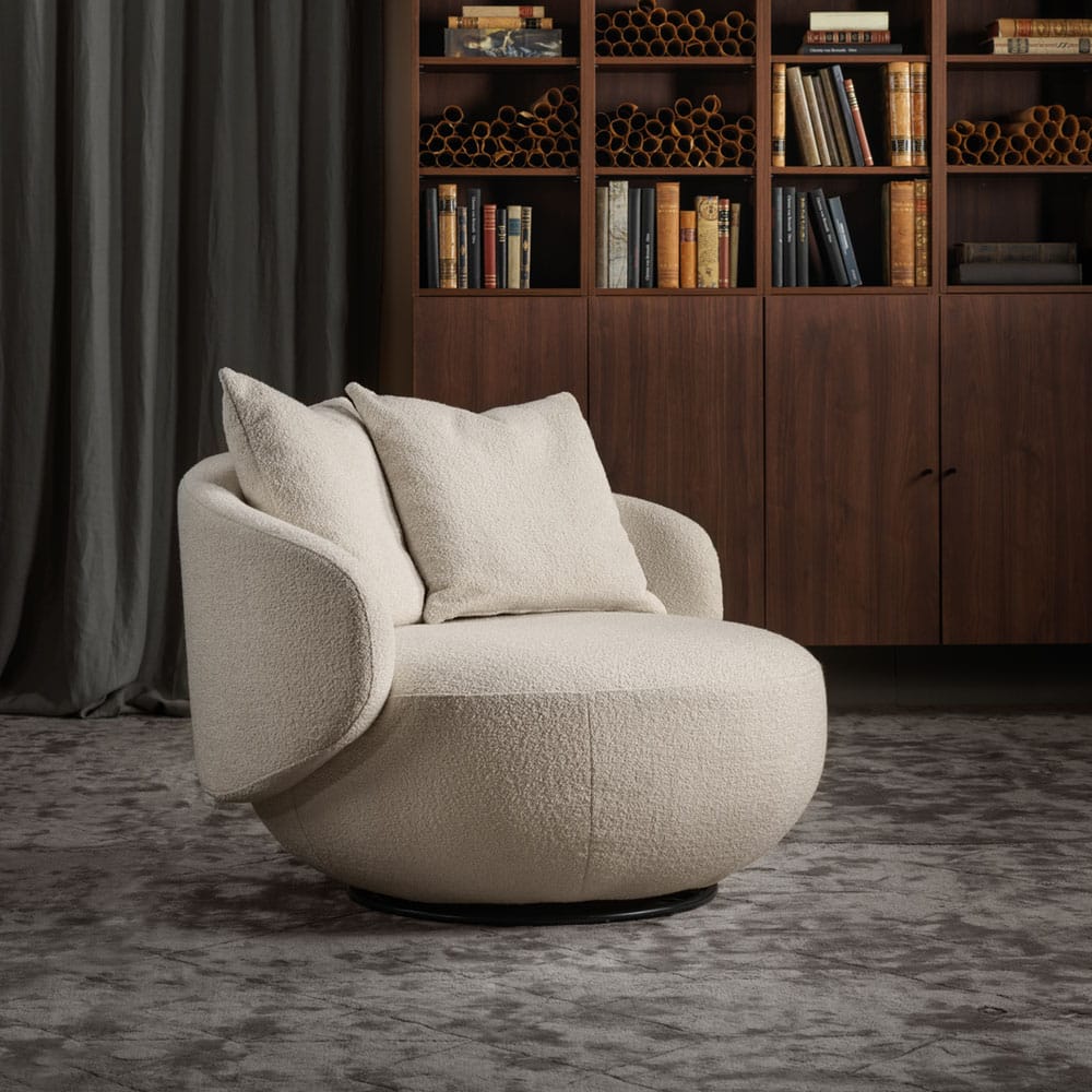 Furninovan Rondo-nojatuoli on nimensä mukaisesti suloisen pyöreä muodoiltaan. Kaartuva selkänoja ja pehmeä höyhentäyte syleilevät istujaa lämpimästi. Tuolissa on kääntyvä jalka.