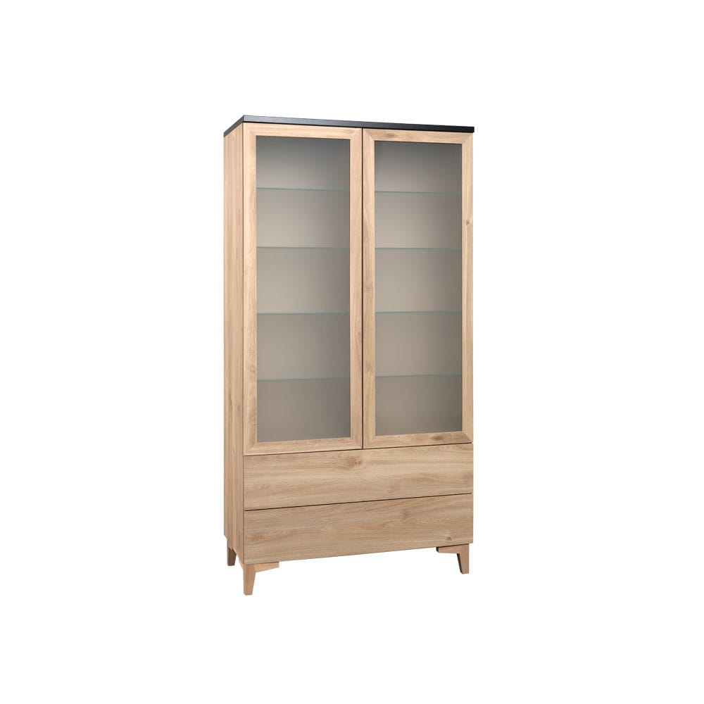 Vitriinissä on MFC-kalustelevystä valmistettu, tammensävyinen runko. Kansiväriksi voi valita joko tammen tai mustan. Vitriinin materiaali on erittäin kulutuksenkestävää ja säilyttää hyvin värinsä.