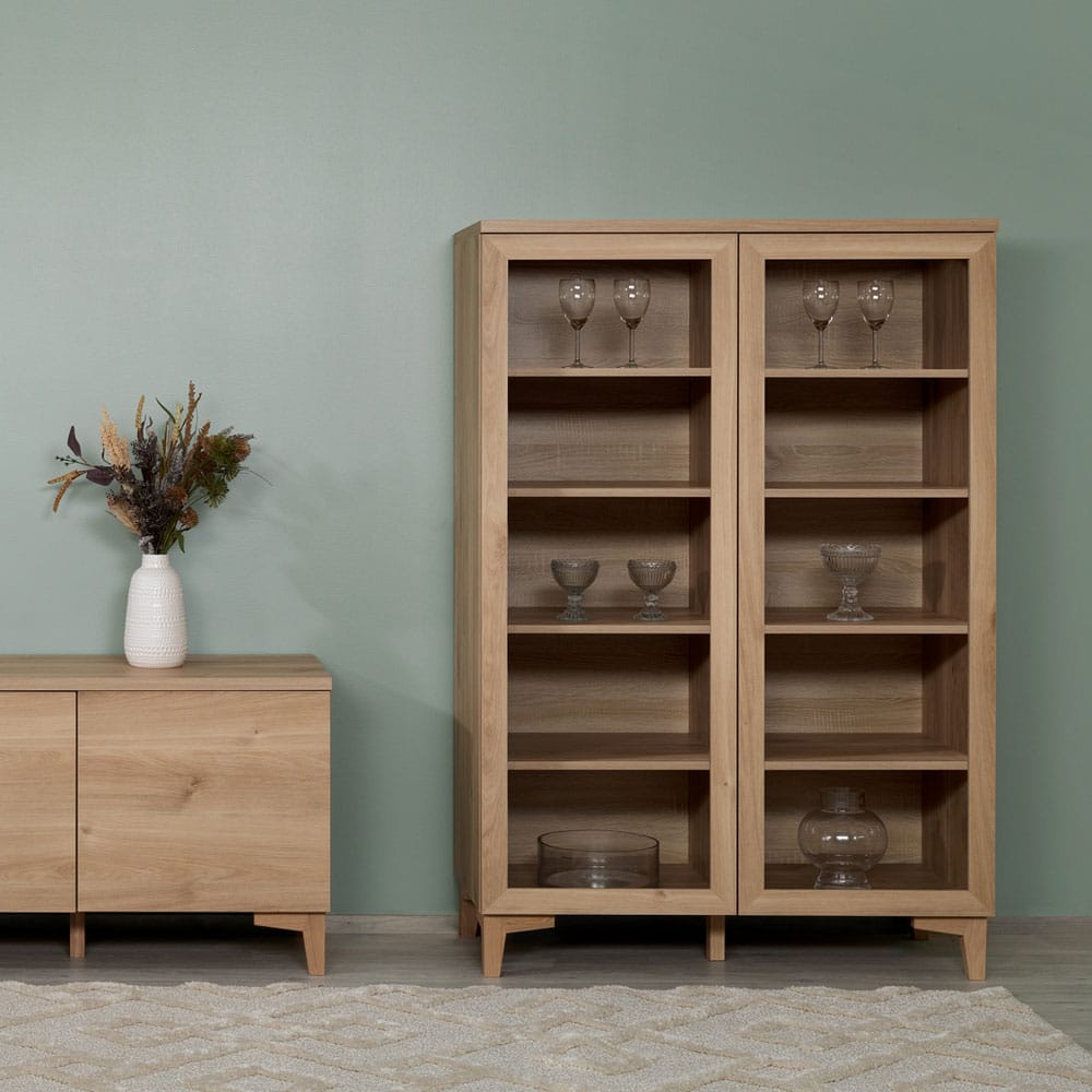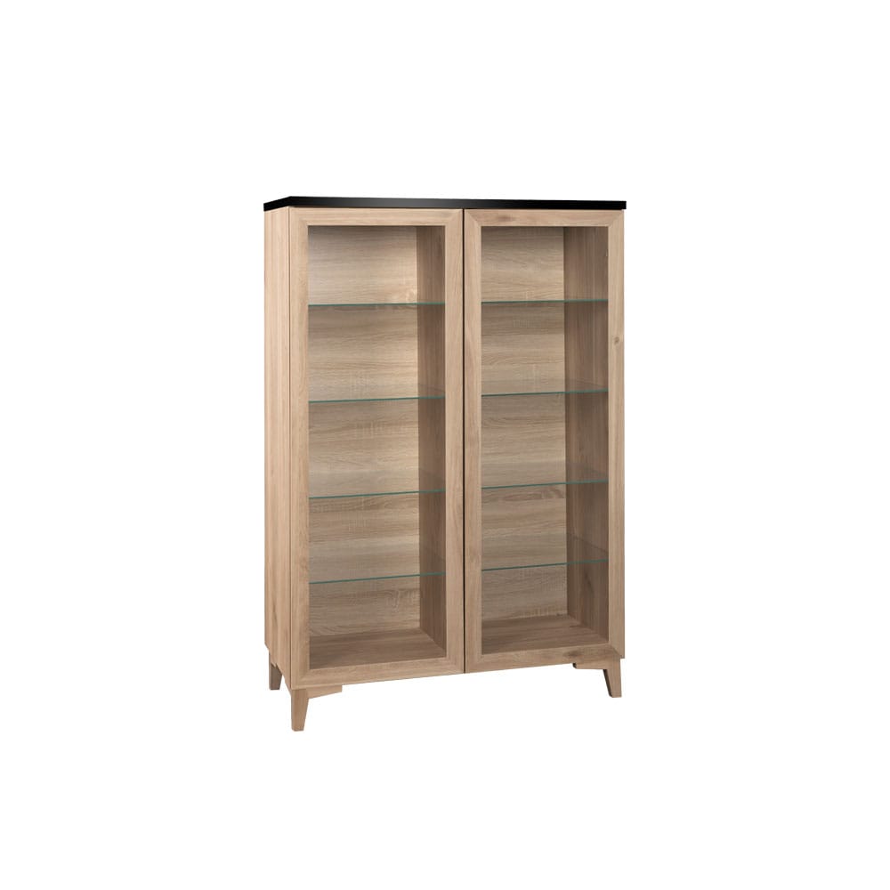 Vitriinissä on MFC-kalustelevystä valmistettu, tammensävyinen runko. Vitriinin materiaali on erittäin kulutuksenkestävää ja säilyttää hyvin värinsä.