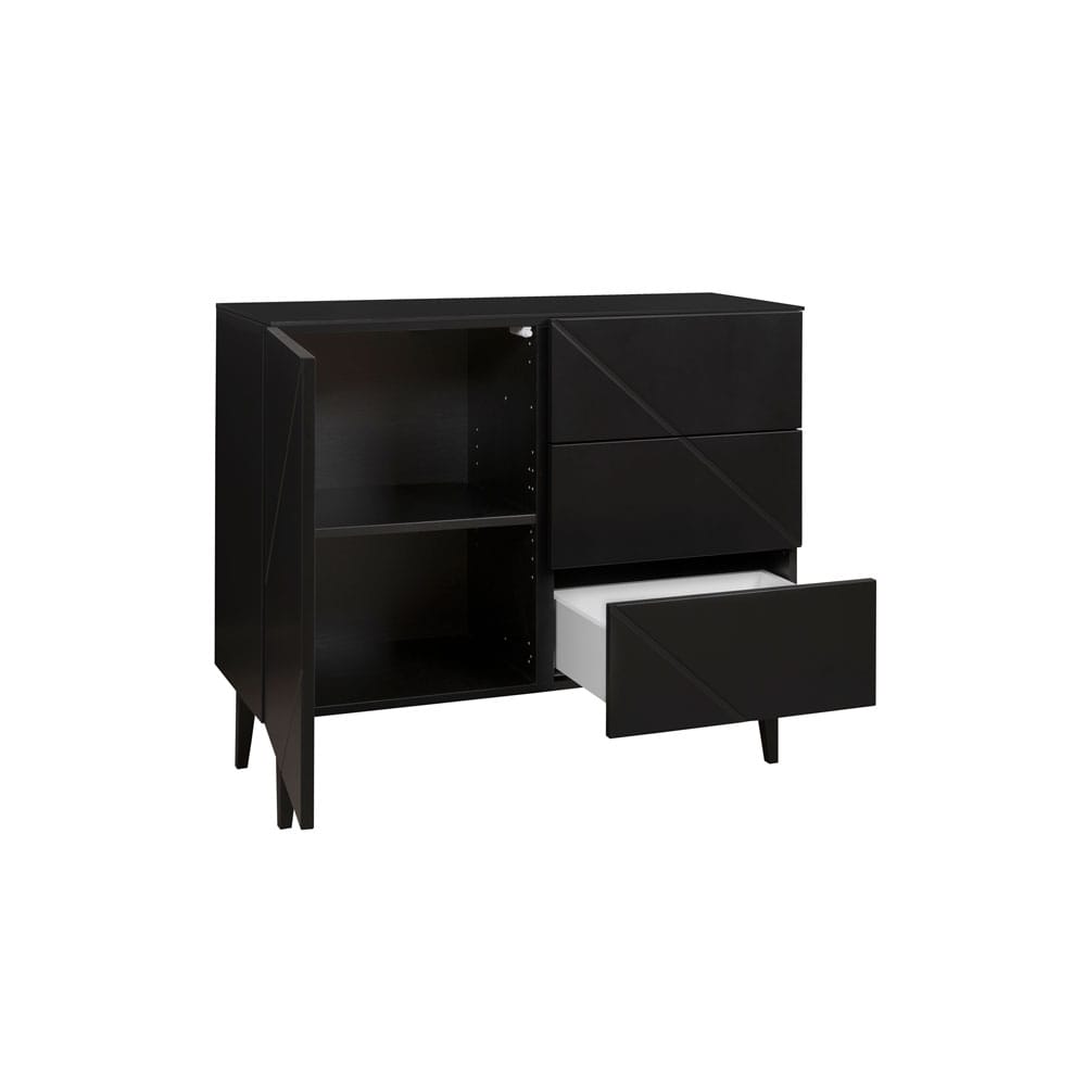 Hiipakan Vilja-lipasto V2.2 sisältää ovellisen kaapin ja kolme laatikkoa. Kaapin ovi on varustettu laadukkaalla push-to-open-mekanismilla, joka tuo kaappeihin käyttömukavuutta ja samalla ehkäisee lipaston naarmuuntumista ja kolhiintumista käytössä – oven avaamiseen riittää, että sitä painaa kevyesti, ja ovi avautuu ponnahtamalla ulos.