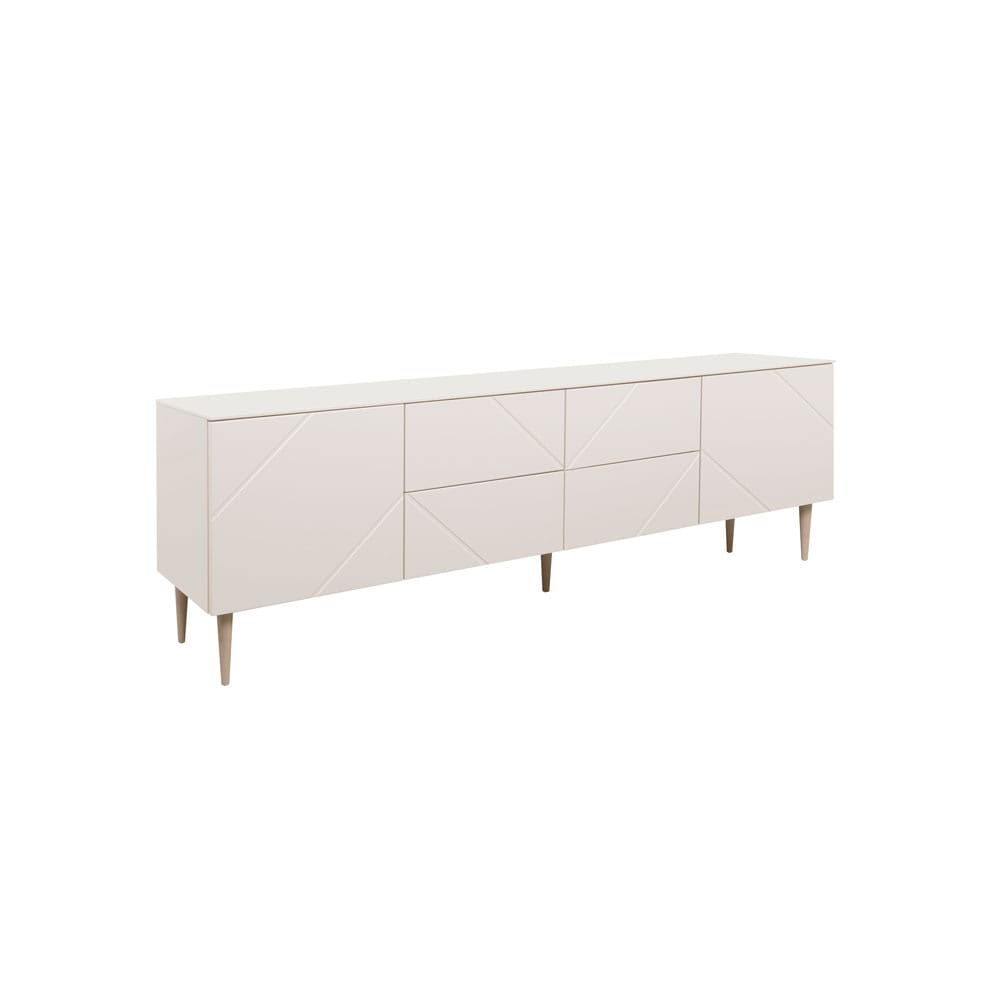 200 cm leveä Vilja-tv-taso riittää suureenkin olohuoneeseen. Tv-tasossa on neljä laatikkoa ja kaksi kaappia, joissa on välihyllyt. Ovet ja laatikot avautuvat painamalla ja sulkeutuvat pehmeästi.
