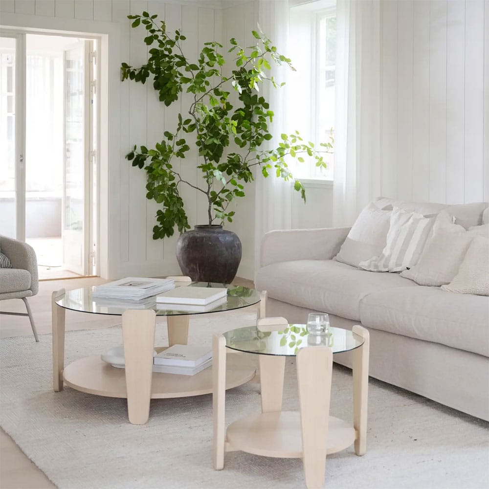 Erikokoisia pöytiä yhdistelemällä voit luoda kauniin kokonaisuuden olohuoneeseen ja saat samalla lisää laskutilaa.