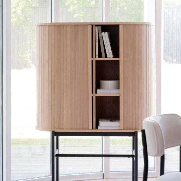 Rowicon Haddington-kaappi hurmaa ovaalilla muodollaan. Kaapissa on valkopestyn tammen värinen tammiviilupinta ja liukuvat ovet. Kaappi on viimeistelty tyylikkäillä messingin värisillä vetimillä. Kaapissa on sirot mustat metallijalat.
