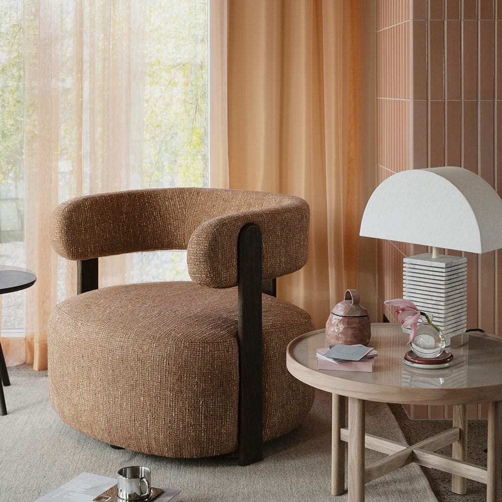 Jenison-nojatuolin vahva muotokieli puhuttelee ja kutsuu viihtymään. Saatavissa meripihkan ruskea ja vaalea beige. FSC®-sertifioitu.