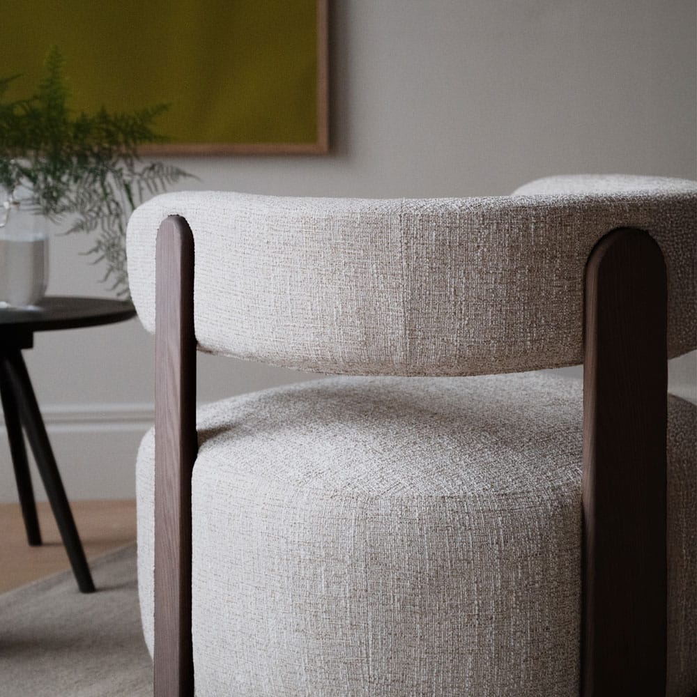 Pyöreä muoto ja pehmeä verhoilu antavat Jenison-nojatuolille suloisen ilmeen. Jenison on luotu luonnolliseksi paikaksi uppoutua lukemaan ja viihtymään. Tummanruskea tammi antaa upean kontrastin pehmeälle istuimelle.