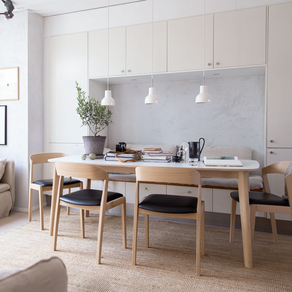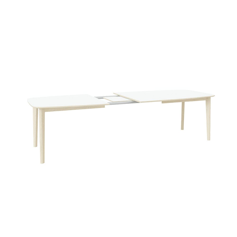 Skovbyn #119-ruokapöytä on varustettu jatkomekanismilla, jossa palat sijoitetaan pöydän keskelle. Pöydän sisällä on säilytystila jatkopaloille, joten niiden säilytys on helppoa.