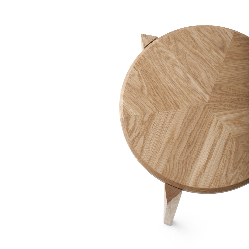 Jakkaran istuinosa koostuu kolmesta yhteen liimatusta palasta, jotka muodostavat elävän ja kiinnostavan kuvion. Kulmikkaat jalat antavat jakkaralle upean veistoksellisen ilmeen.