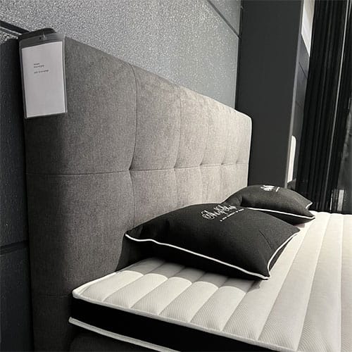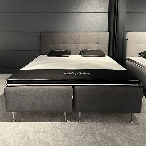 Interactive-sängyissä on harmaa Mine-kangasverhoilu ja metallijalat. Pääty sisältyy hintaan.