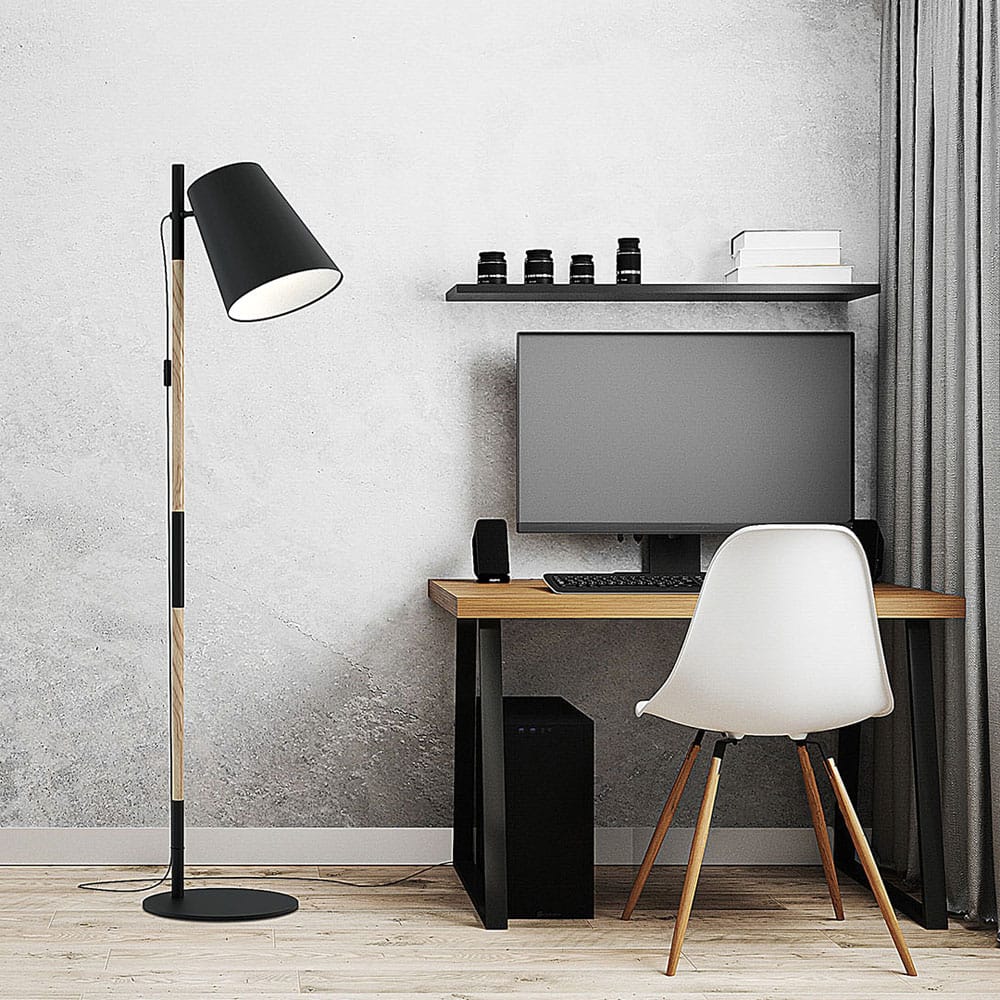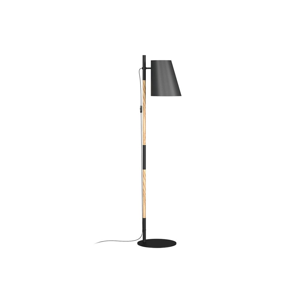 Valaisin Grönlundin Finder-lattiavalaisimen antia ovat selkeät muodot, harmoniset värit ja puiset yksityiskohdat. Valaisimen kupu on musta ja varressa leikittelevät vaalean puun ja mustan metallin sävyt.